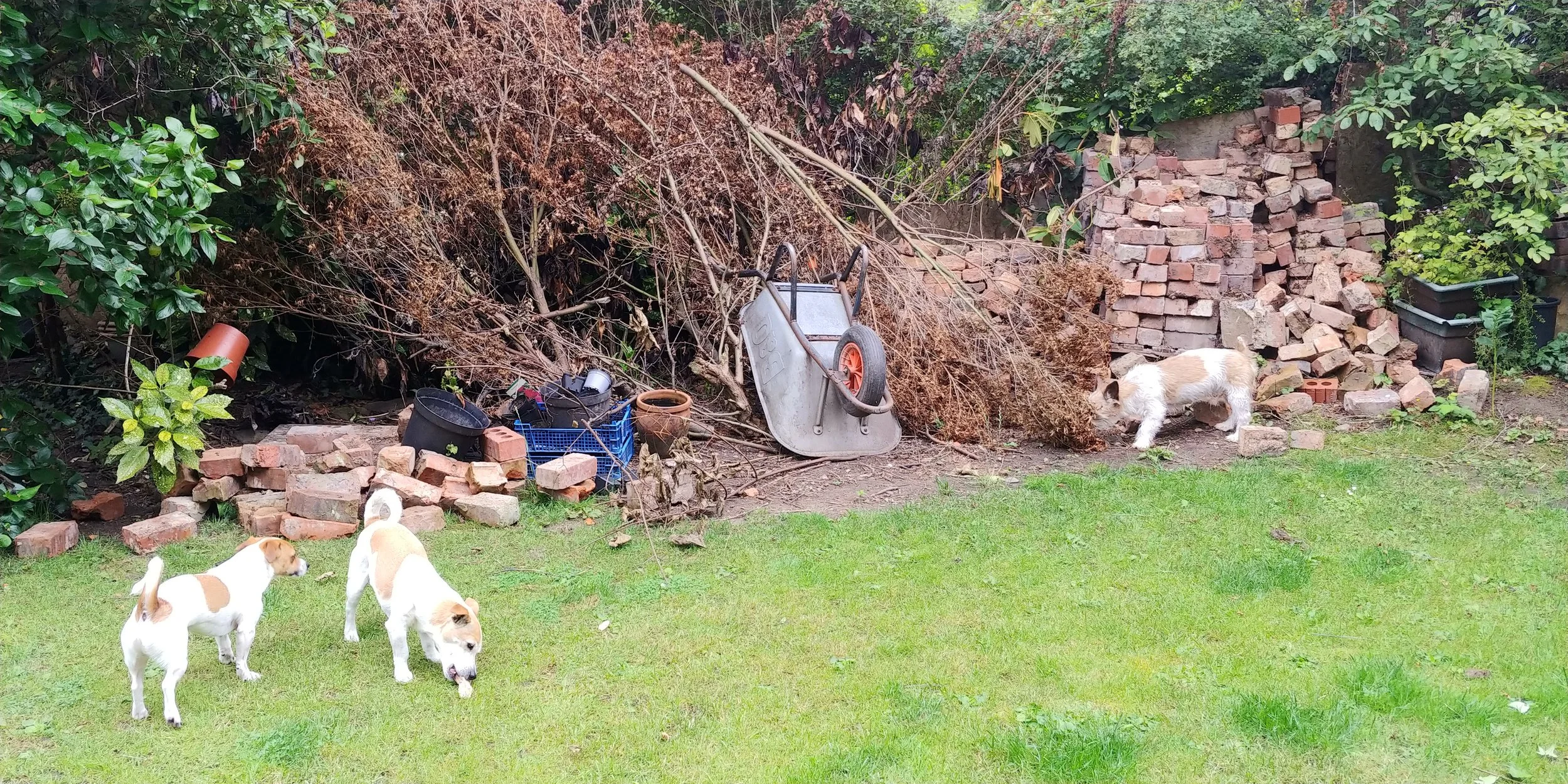 The most time-consuming part of the job was hauling the bricks. We had multiple stacks of bricks hidden behind various shrubs at the end of the garden - and because not all the bricks were suitable (some were too heavily coated in mortar on the tops, or were chipped in odd places), I had to take each stack apart to find the bricks I wanted, stack them in a wheelbarrow, wheel them over to the patio area, and unload them. Each brick weighs about 3kg and I used about 700 of them, so that’s over two tonnes of bricks shifted just for the patio, let alone the ones that I picked up, assessed, and discarded. If you’re attempting this project, you could divide the work into two - phase one to identify and stack the bricks next to your working area, and phase two to actually lay them. I did the whole thing in a single day, which was feasible but exhausting. Oh, and of course wear rigger gloves - gardening gloves won’t cut it. I actually wore a hole in my rigger gloves after about 8 hours and had to switch to a new pair.